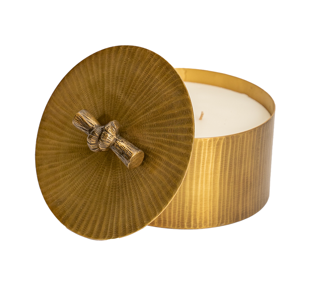Copper Finish Knot Boxed Candle. Fragrance Dark Amber.