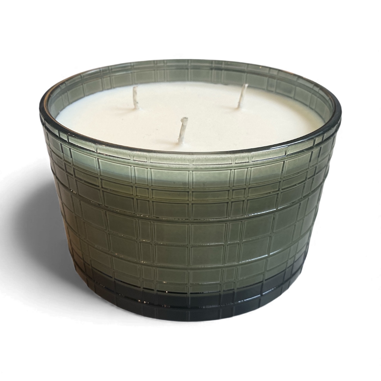 This  stunning Brickwork Candle in a rich and earthy green vase, with an uplifting natural 3 wick candle set